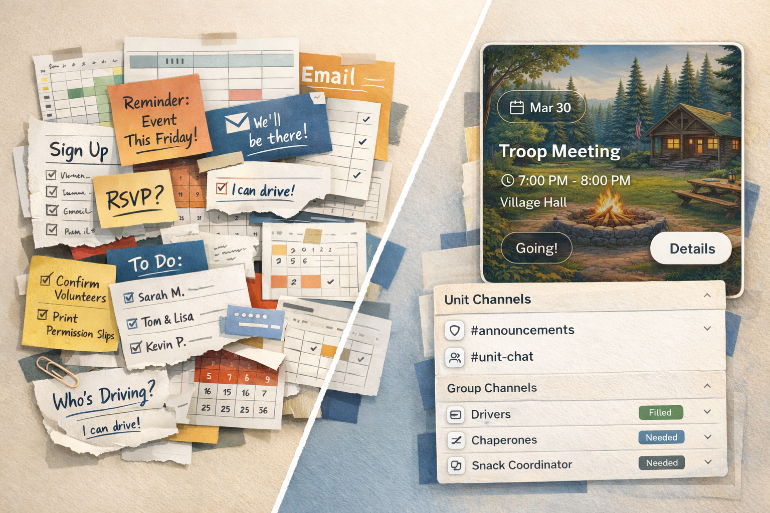 Most units coordinate across Scoutbook, texts, email, and signup sheets. It works until it does not. When plans change, leaders do the stitching themselves.