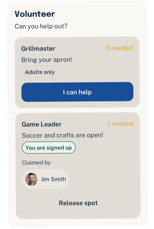 Drivers, gear, and reminders stay attached to the event instead of buried in chat.