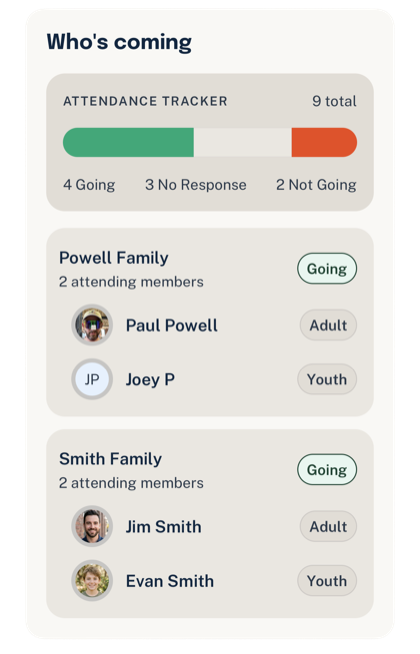 Parents or guardians respond once for the household so leaders see one trusted answer instead of piecing together replies.
